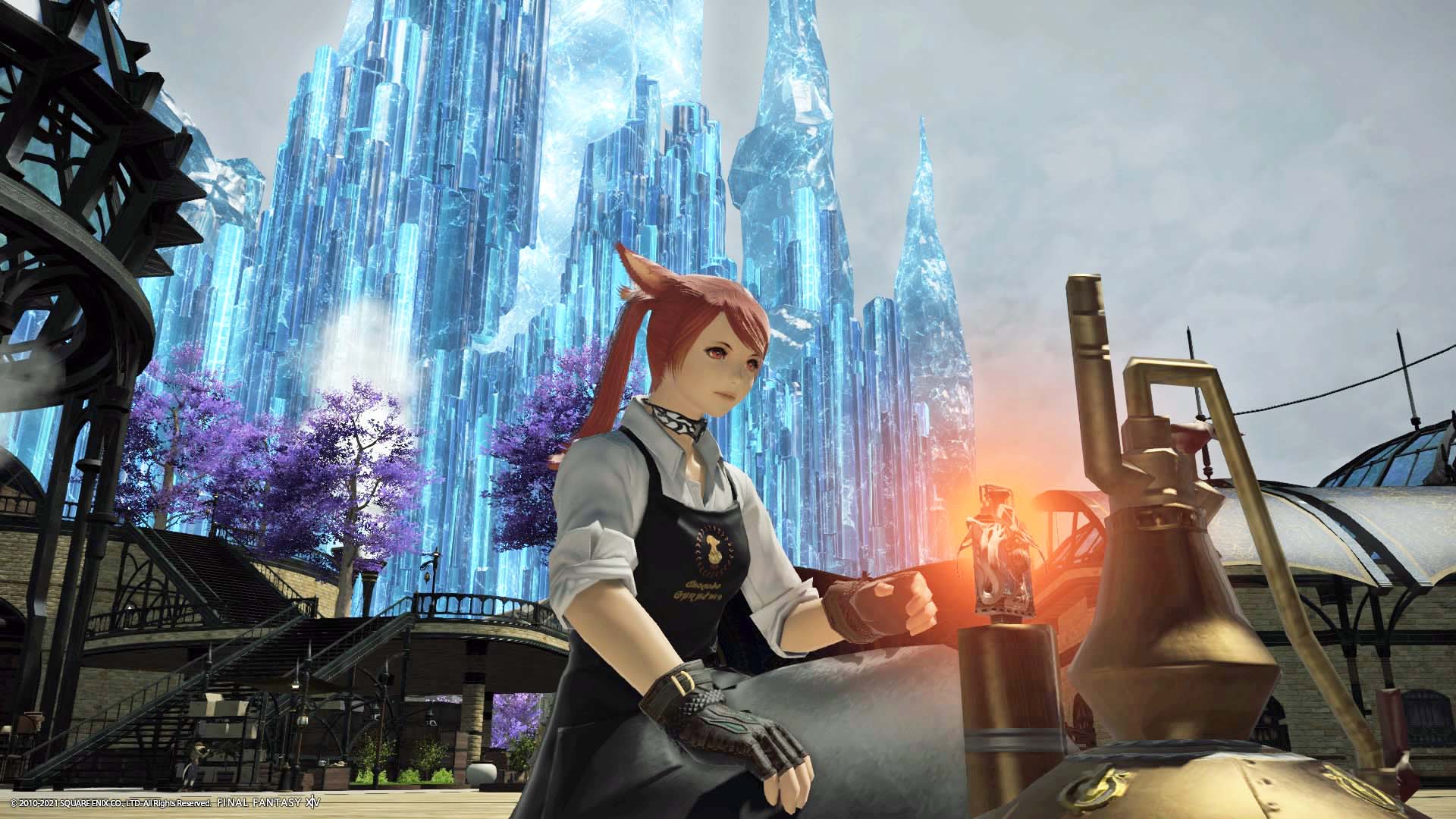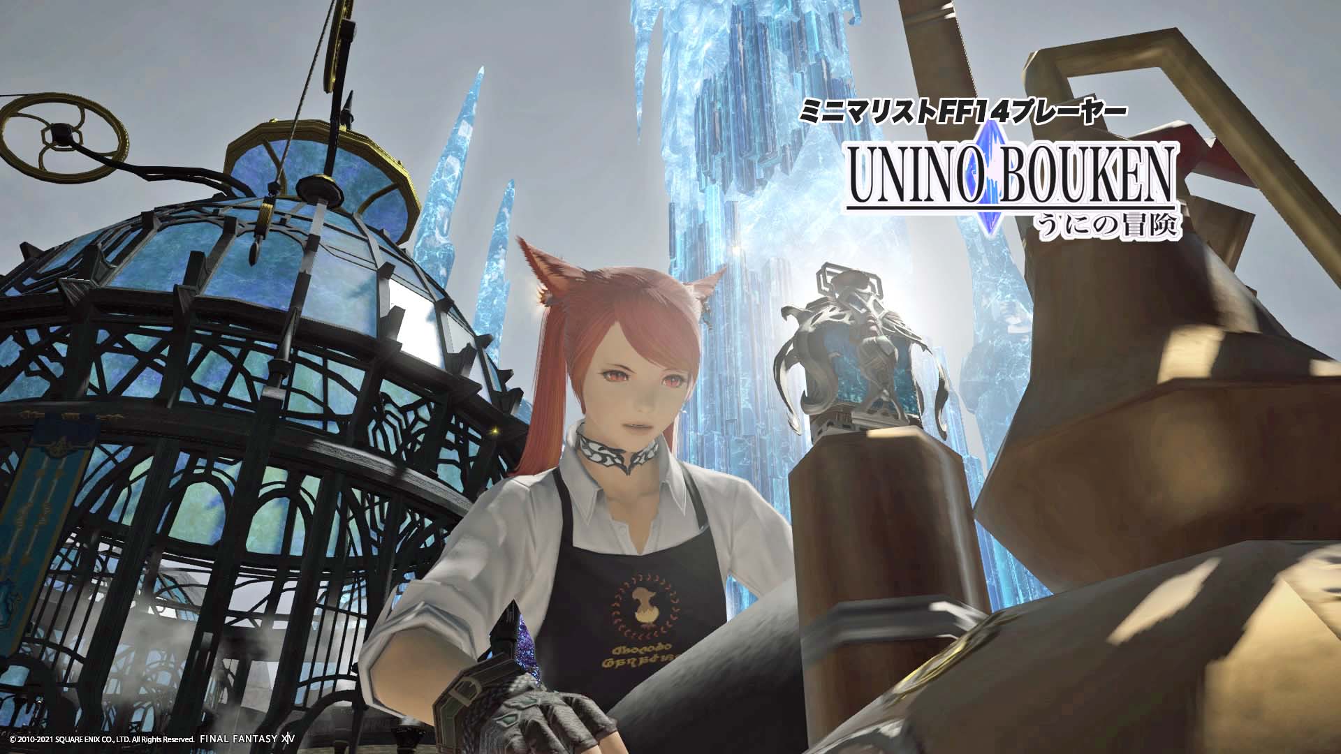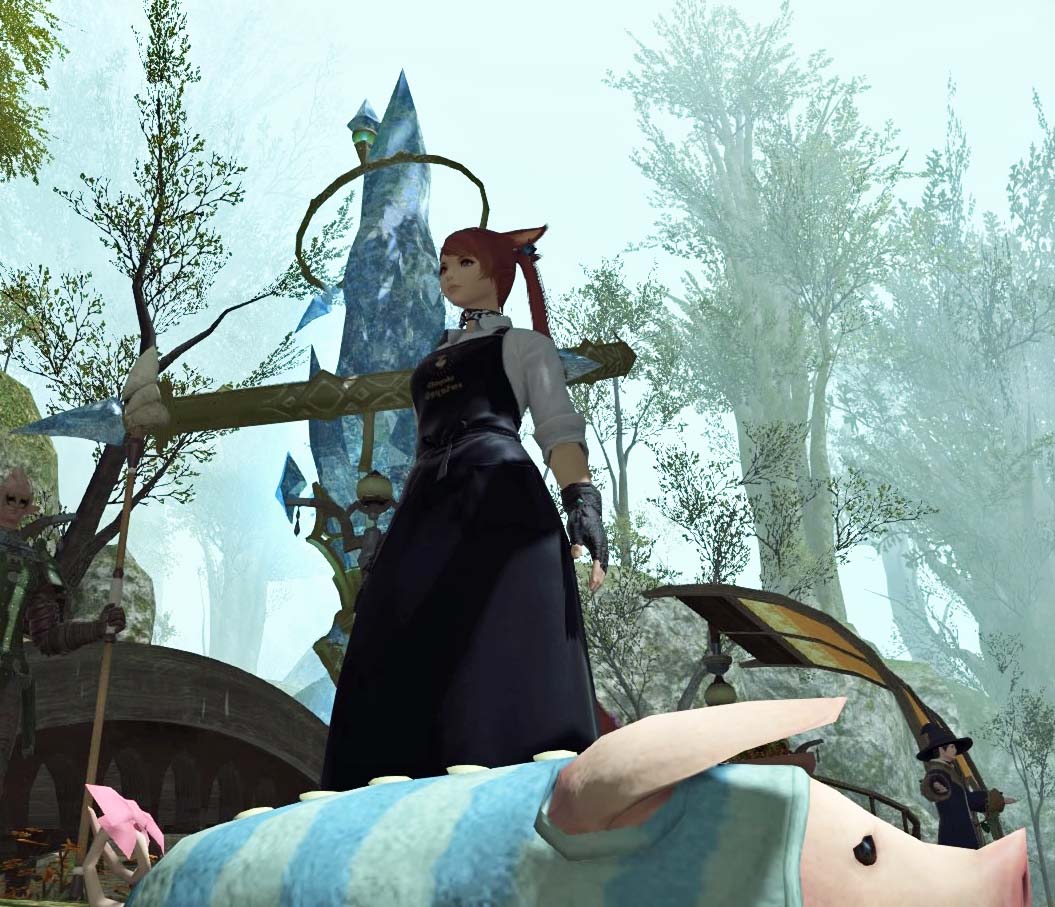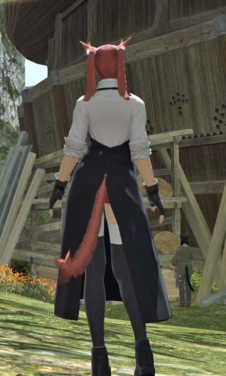 武具投影で胴は蒼天街の振興券で手に入れるシンプルな黒のエプロンと脚は初期装備であるミコッテロインクロスに。