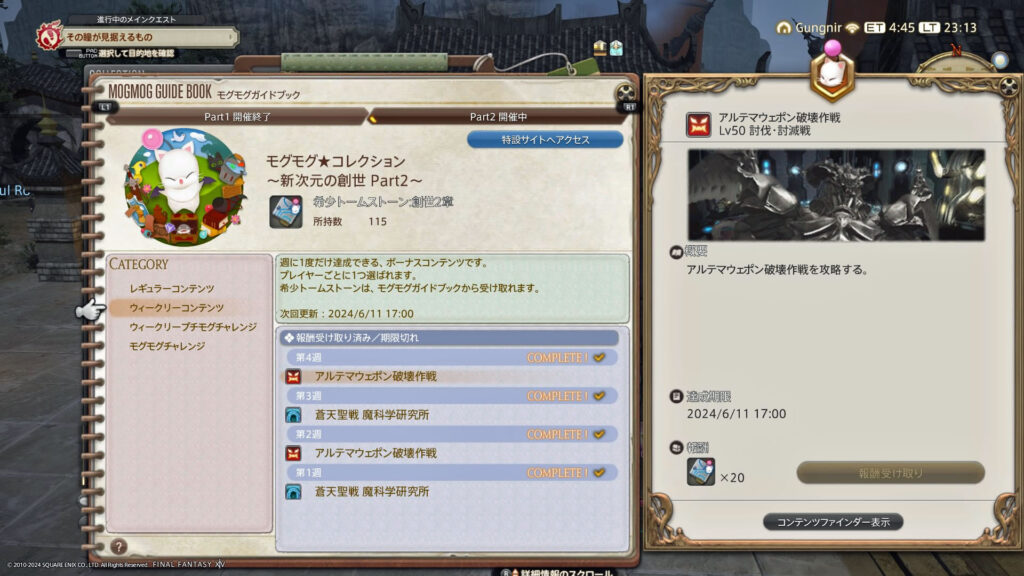 探索コンテンツ「六根山」攻略、モグコレと呼ばれる「モグモグコレクション 〜新次元創世 パート2〜」希少トームストーンというものを集めてレアアイテムゲットのためのコンテンツのFCメンバーとの周回。地下迷宮を巡る「死者の迷宮ディープダンジョン」攻略